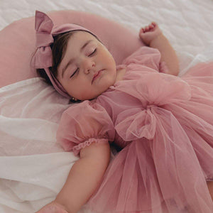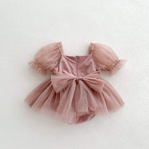 Featuring soft layered tulle, whimsical puff sleeves, a generous statement bow at the back, and built-in snap-button bloomers, this outfit provides both style and practicality. The inner cotton-blend lining ensures all-day comfort, while the zipper closure at the back allows for easy dressing. Designed for babies who love to move, pose, and explore—beautiful, comfy, and picture-perfect.