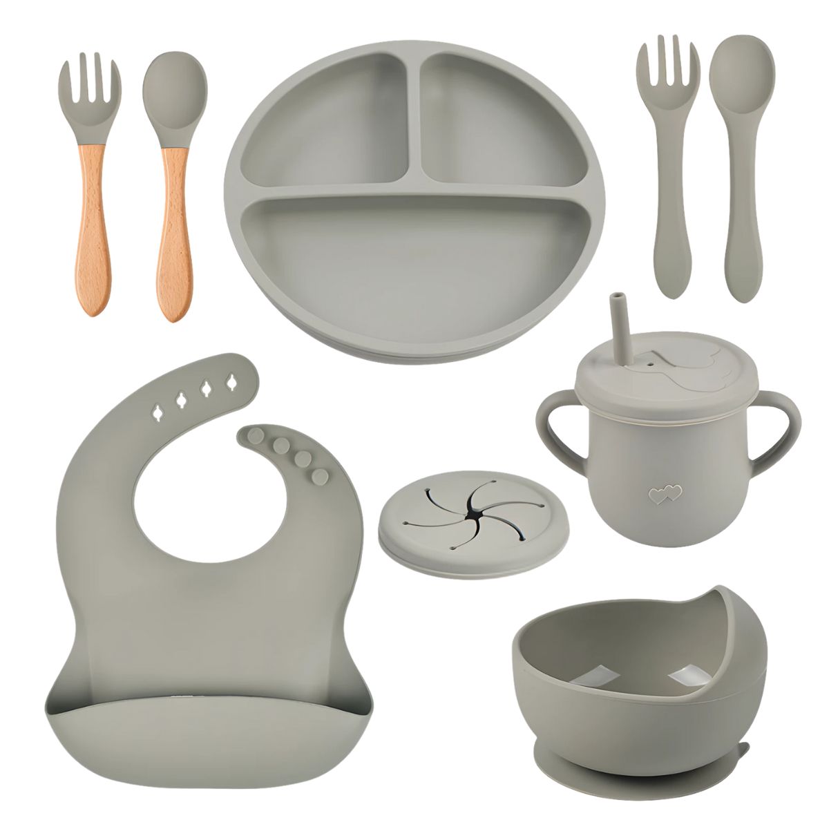 • Set Components: Includes 1 x Bib, 1 x suction plate, 1 x wooden spoon, 1 x wooden fork, 1 x suction bowl, 1 x bear fork, 1 x bear spoon, 1 x straw cup, 1 x straight cup, 1 x straight cup lid.
